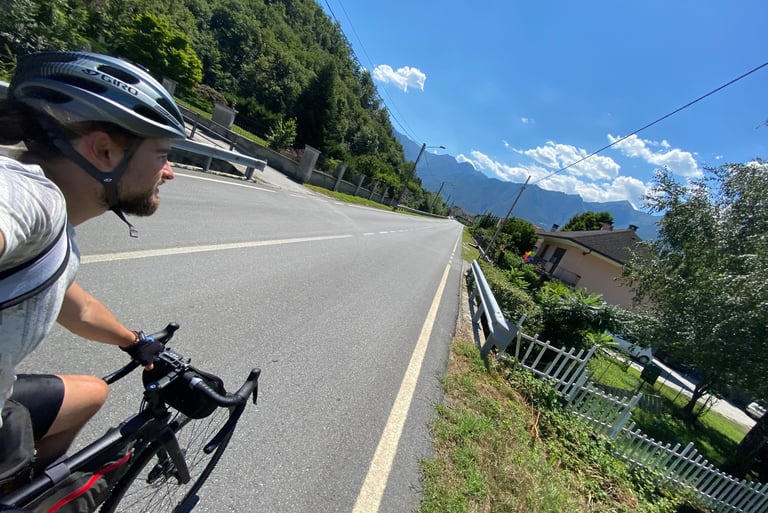 From Visp, the road wound toward the Italian border. Fatigue set in. Nights grew colder. One failed attempt at crossing into Italy by bike taught me an important lesson: before such a trip, train your body. Don’t spend evenings on YouTube instead of working out. Switzerland demands strength. Eventually, the road led down into Domodossola and, finally, Milan—a cultural explosion after weeks of mountain solitude.